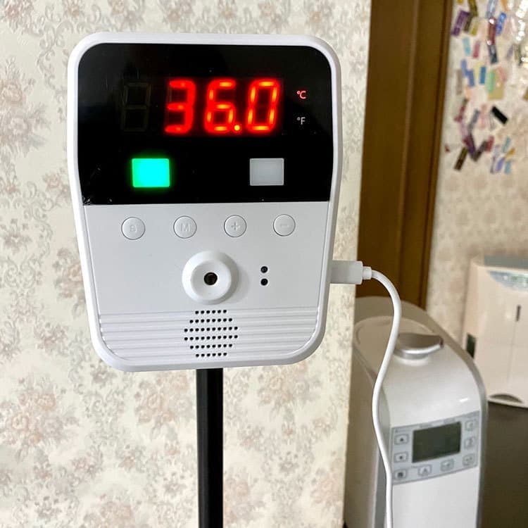 こちらはダンススタジオ入り口に設置しており、手をかざすだけでスピード検温いたします。手動の検温ではなく自動の検温機を導入しております。